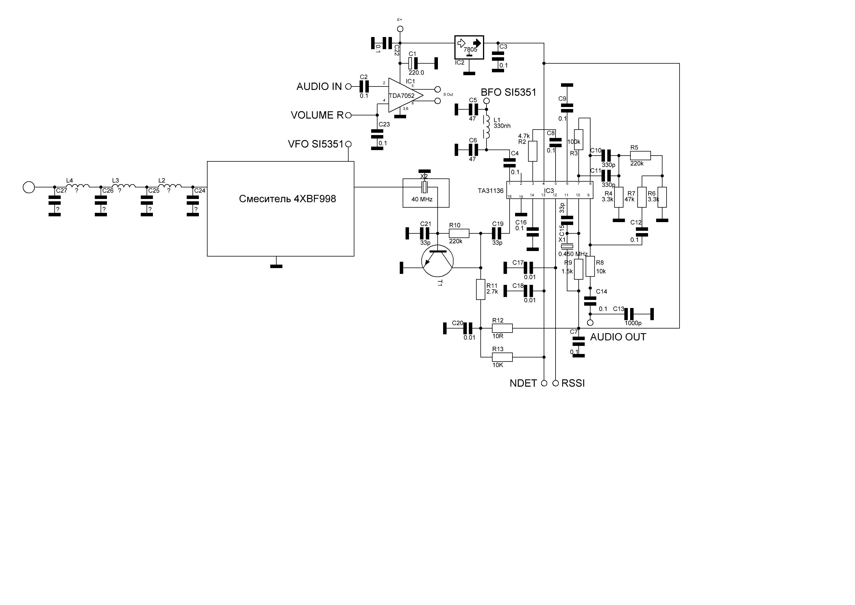 Здравствуйте.Вот приблизительно так я вижу конструкцию целиком.Есть ряд вопросов.Хватит ли чувствительности?И можно ли обойтись фнч по входу.Гляньте пожалуйста,возможно я что то пропустил ?А еще назначение с21 с ним намного лучьше ачх,практически идеальная.И еще вопрос нужен ли фнч L1 ? В промышленных схемах он есть