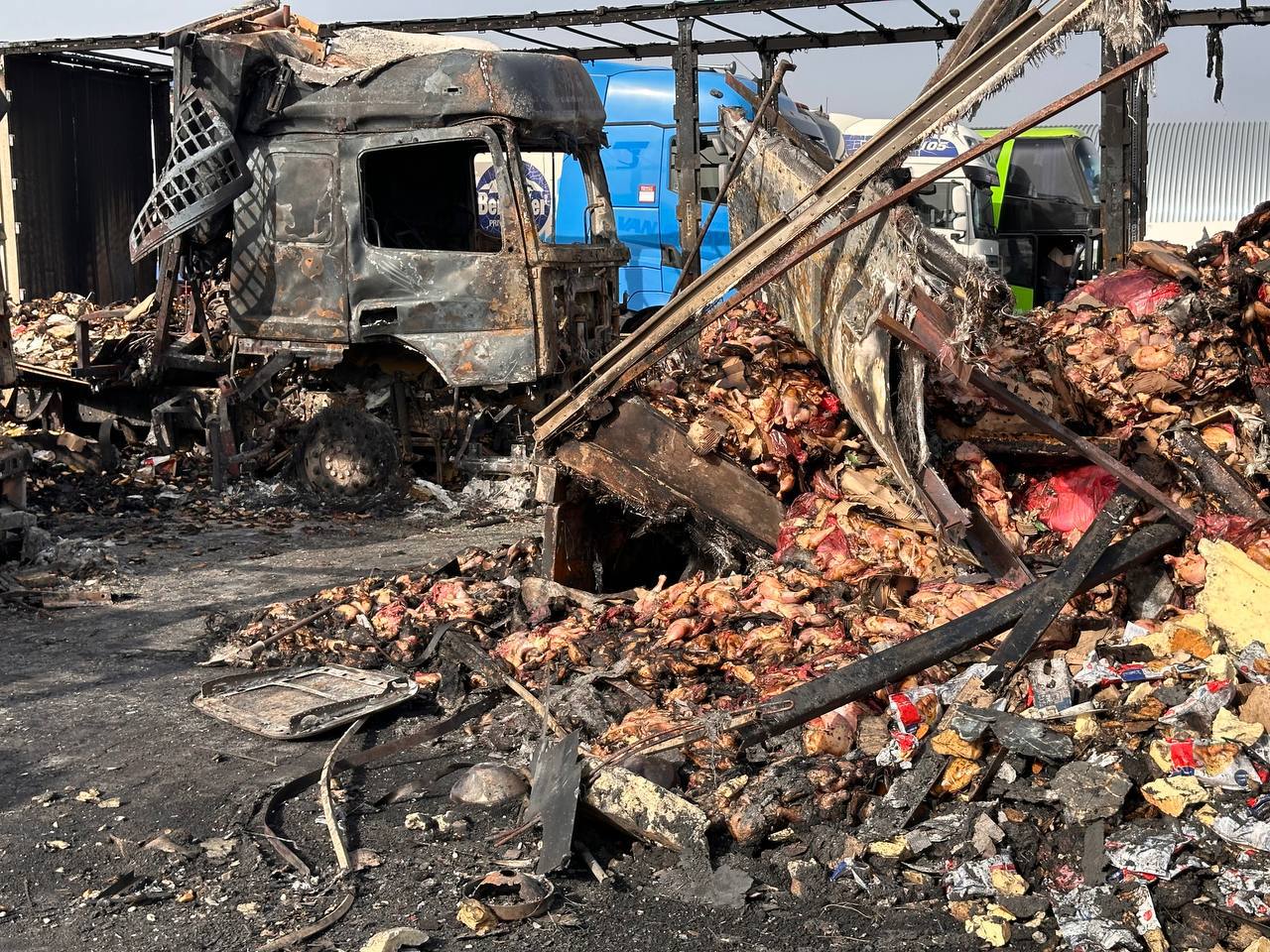 Кроме бомбежек городов КАБами кацапские гниды воюют с курятиной и зерном. Вот результаты последних атак в Измаиле - сгоревшее зерно и фуры с курами. И это не случайно прилетело или пво сбило. Это целенаправленные удары. Цель понятна - голод в стране.