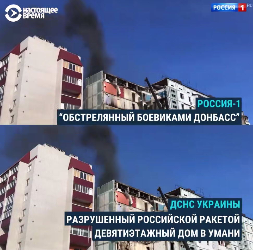 Рашатв демонстрирует кадры разрушенной многоэтажки в Умани выдавая их за якобы обстрелянный Донецк.