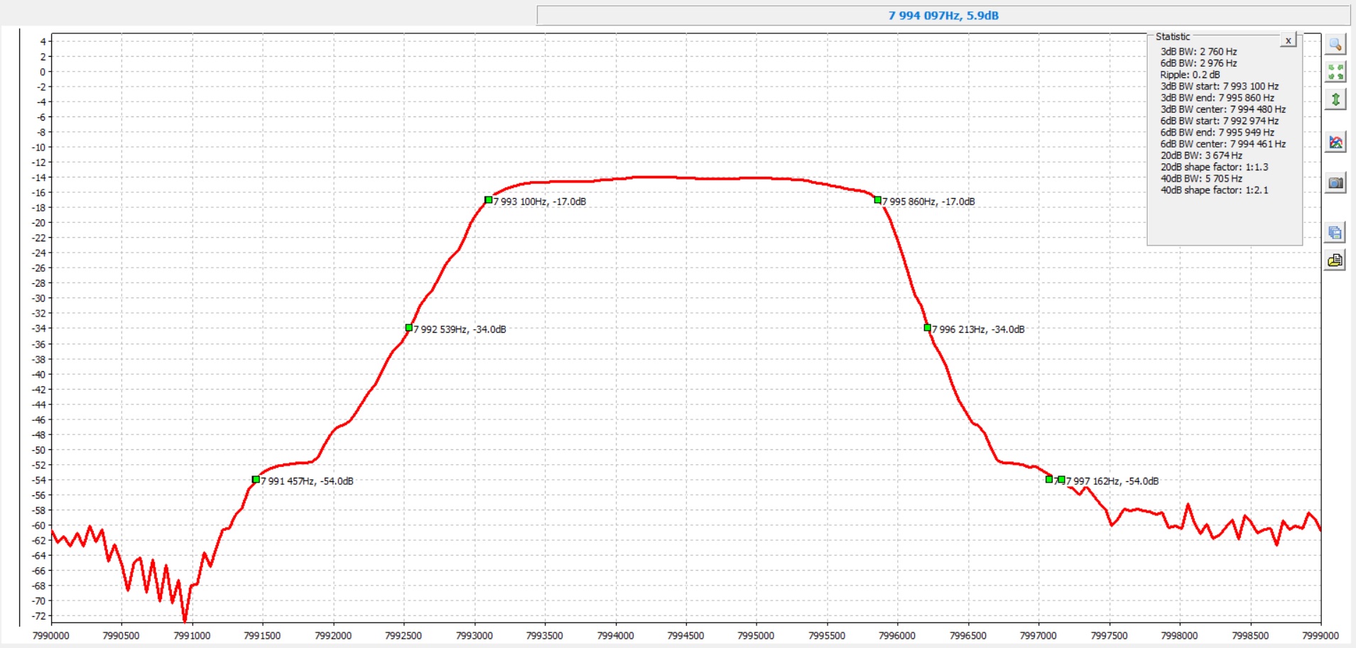 Прямокутність правого кута сильно залежить від рівності резонансних частот пар резонаторів на кінцях ланцюжка. При цьому частоти обох пар можуть несуттєво різнитись. Чим краще підібрані по частотах резонатори, тим рівніше вийде цей кут АЧХ. І ще грався з "перетасовкою" кристалів в самому ланцюжку. Це все робив з запаяними конденсаторами на плату фільтра, в стенді. Металізація отворів на кварцах дуже допомогла в цьому. Нижче один з моїх фільтрів.
