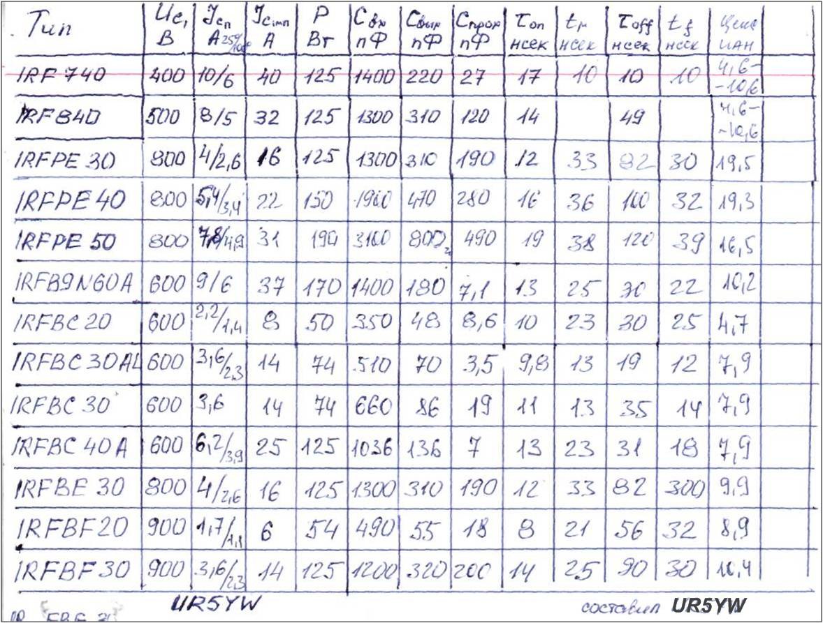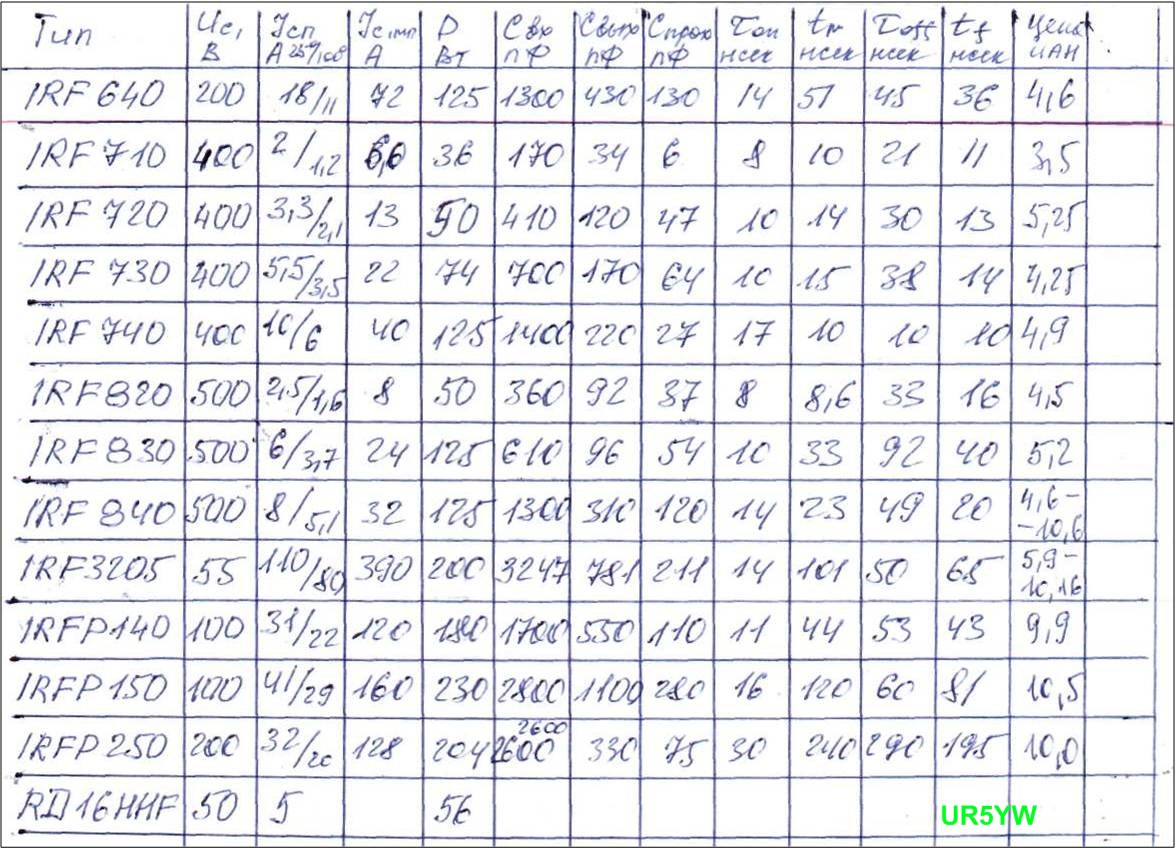 UR5YW на основании данных из даташитов Vishay сделал сводную таблицу параметров силовых ПТ.