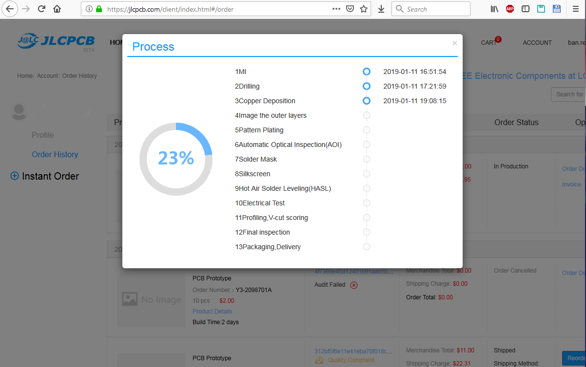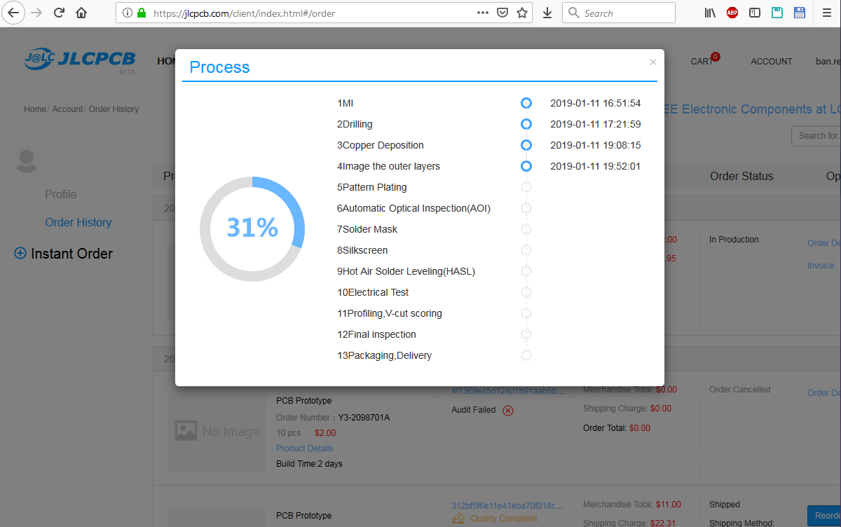Заказ плат выглядит следующим образом. Загружаете гербер. Выбираете количество и параметры платы, адрес и метод доставки. Оплачиваете кредиткой или пайпалом. Все - плата сразу же уходит в производство. За статусом заказа следите на сайте. Вот пока писал этот пост - еще одна стадия завершилась