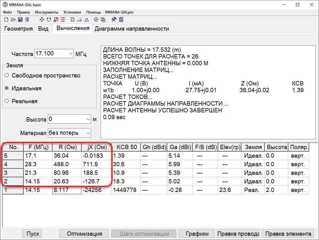 Так как DL2KQ не дает значения импеданса по диапазонам, то в MMANA был смоделирован вертикал длиной 425мм проводом 1мм. Автор говорит что частота собственного резонанса должна быть 17.1МГц