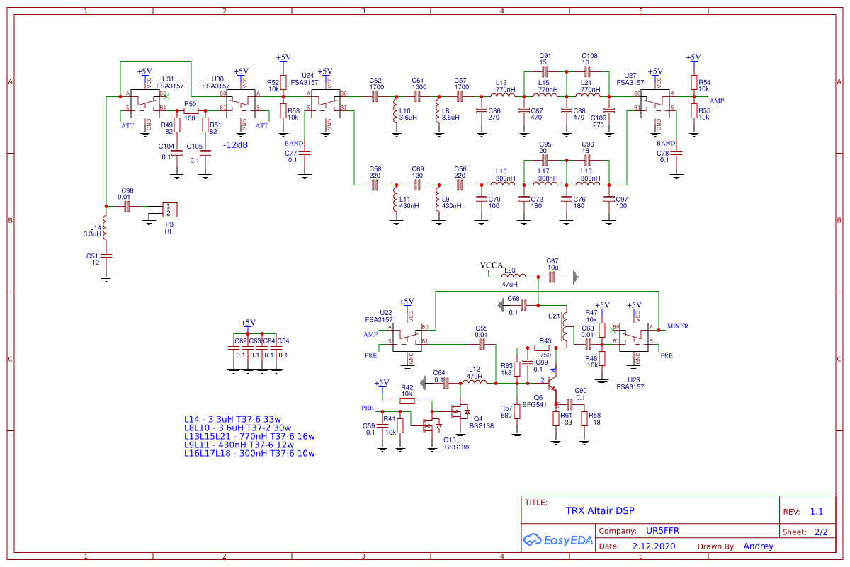 Данный проект изначально задумывался как гибридный тракт с цифровой обработкой сигнала. Поэтому искать схему Altair'а без DSP безсмысленно :) По структуре это супергетеродин с ПЧ 24.573MHz. Выбор такой высокой ПЧ позволил существенно упростить входные фильтры и свести их к двум полосовым фильтрам которые перекрывают 2-14MHz и 14-30MHz.
