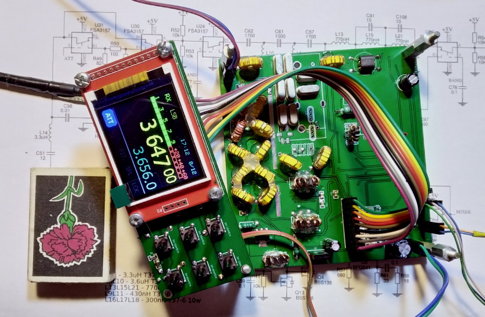 Применен модифицированный смеситель Брагина RZ4HK. Впервые этот вариант смесителя был описан в моей статье "Пассивные смесители" в 2013. После смесителя сигнал через диплексер поступает на кварцевый QER фильтр шириной 10kHz. Выбор такой широкой полосы обусловлен желанием иметь не только SSB, но и АМ. Согласование фильтра выполнено с помощью Г-цепочек. Фильтр собран из купленных на али кварцев на частоту 24.573MHz в корпусе "лодочка". Отбор и замер производился с помощью NWT.