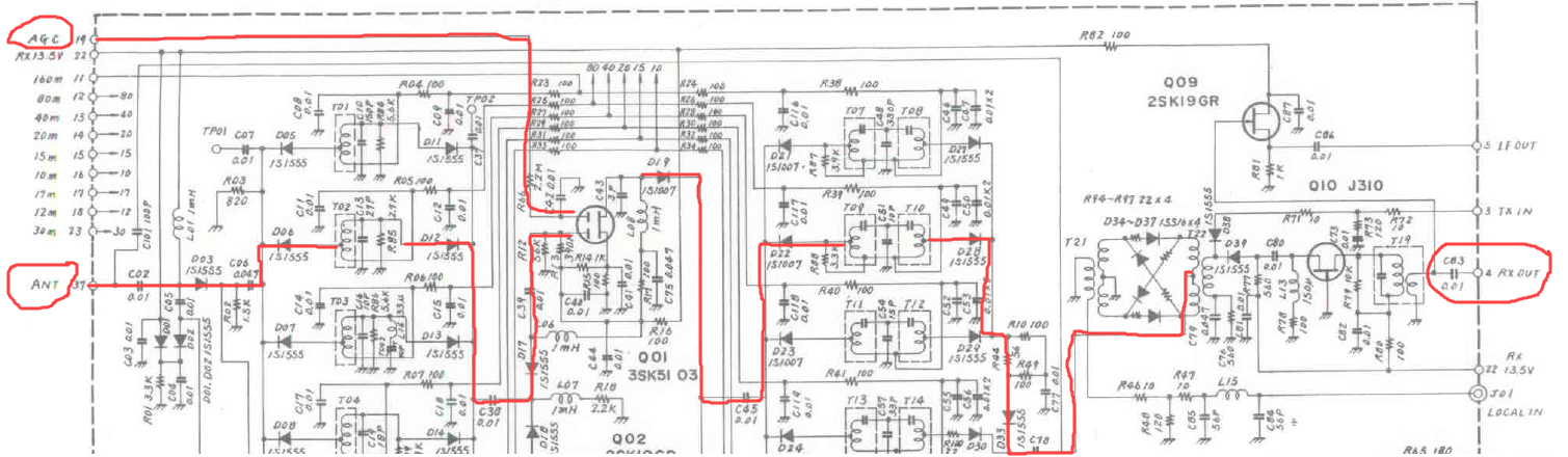 Сигнал с антенны подается на однокотурный ПФ который полностью включен в затвор неотключаемого УВЧ. Нагрузкой УВЧ служат двухконтурные ПФ, далее стоит обычный кольцевой диодный смеситель. И чтобы еще больше угробить динамику в УВЧ на второй затвор заведен сигнал АРУ, который снижает усиление за счет уменьшения крутизны транзистора при уменьшении тока стока. А как известно чем меньше ток рабочей точки, тем хуже динамика каскада.