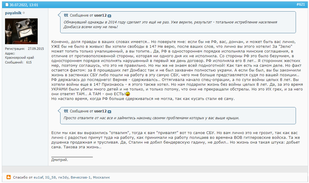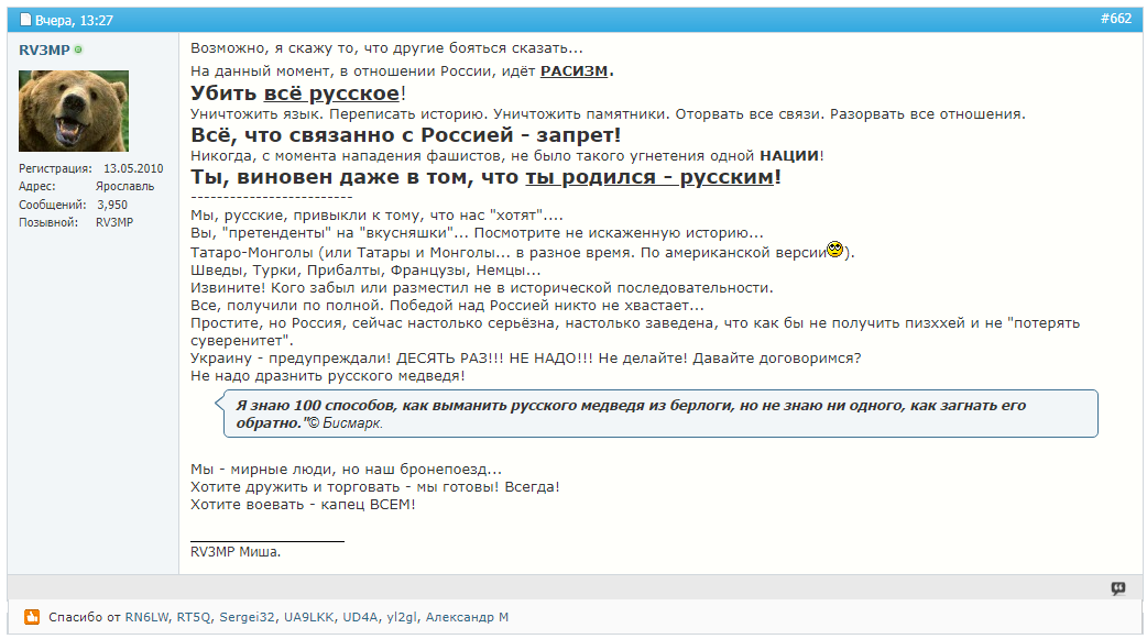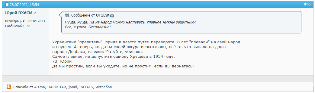 Краткая предистория. На форуме cqham модераторы решили дать народу "выпустить пар" по поводу войны. Накатав за пару дней под сотню страниц тему прибили. Потому что походу вышел не пар, а какие-то миазмы.