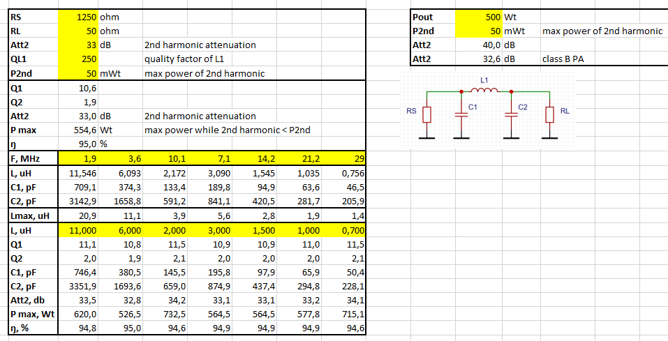 Точно так же как и для обычного П-контура для Pi-L network можно вывести формулы расчета по требуемому подавлению второй гармоники. Сами формулы приводить не буду - там ничего особо интересного нет.